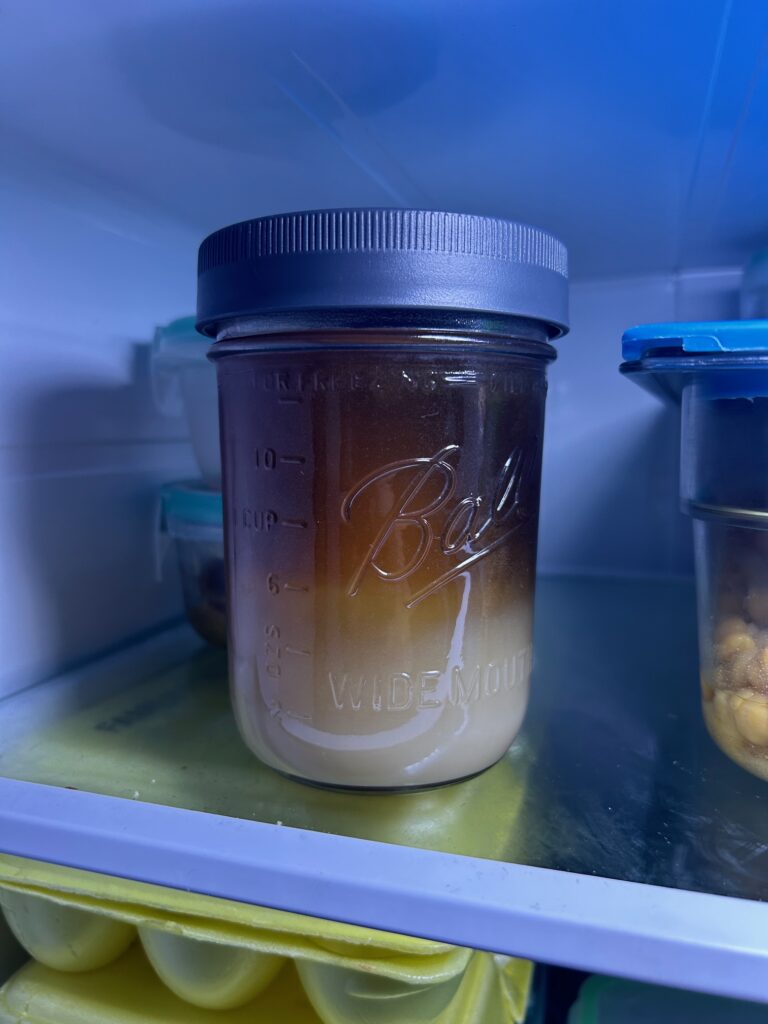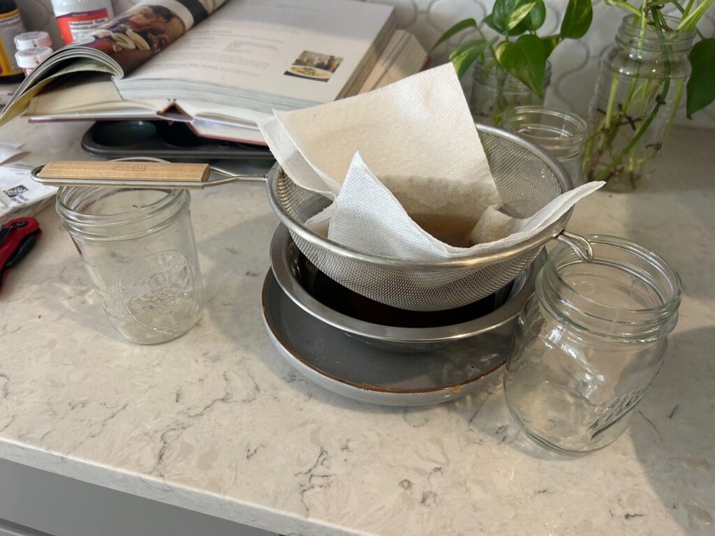 Step 5: Once done, use a strainer to get the big chunks of fat out and cheese cloth or a paper towel to get the small bits of burnt fat residue out. Once “double” strained and it looks clear, move to a glass container and let cool. And yes the straining needs to take place while the tallow is hot!! Let cool down and store in the refrigerator. Cover once completely cooled down. It should be a white color (from my experience).